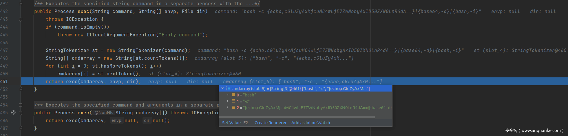 直接通过 Runtime.getRuntime().exec(Command); 没有成功创建 1.txt。通过 Runtime.getRuntime().exec(new String[]{“/bin/sh”, “-c”, Command}); 成功创建 1.txt。 于是尝试对 Runtime.getRuntime().exec(Command); 进行调试分析。
