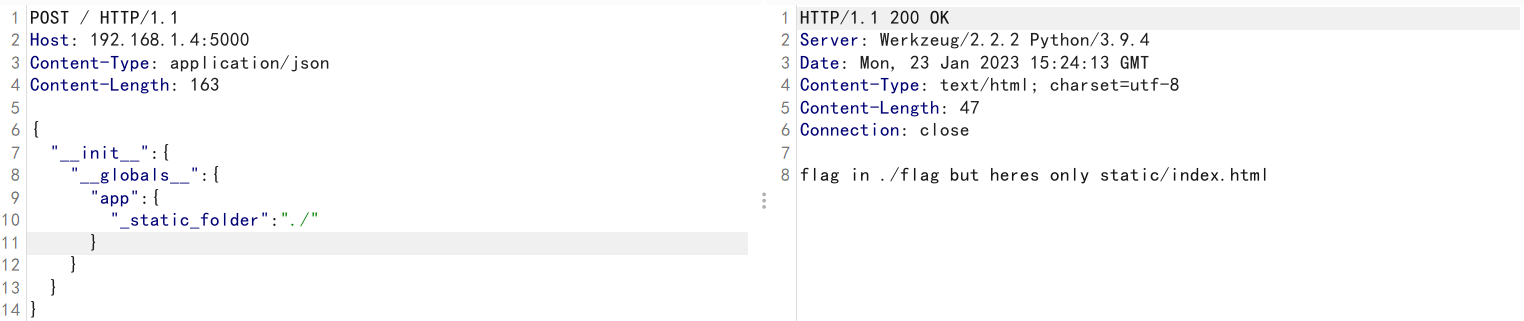 1 2 3 4 5 6 7 8 9 10 11 12 13 14 15 16 17 18 19 20 21 22 23 24 25 26 27 28 29 30 31 32 33 34 35 36 37 38 39 40 41 42 43 44 from flask import Flask,requestimport json app = Flask(__name__)def merge (src, dst ): for k, v in src.items(): if hasattr (dst, '__getitem__' ): if dst.get(k) and type (v) == dict : merge(v, dst.get(k)) else : dst[k] = v elif hasattr (dst, k) and type (v) == dict : merge(v, getattr (dst, k)) else : setattr (dst, k, v)class cls (): def __init__ (self ): pass instance = cls() flag = "Is flag here?" @app.before_first_request def init (): global flag if hasattr (app, "special" ) and app.special == "U_Polluted_It" : flag = open ("flag" , "rt" ).read()@app.route('/' ,methods=['POST' , 'GET' ] ) def index (): if request.data: merge(json.loads(request.data), instance) global flag setattr (app, "special" , "U_Polluted_It" ) return flag app.run(host="0.0.0.0" ) flag{U_Find_Me}