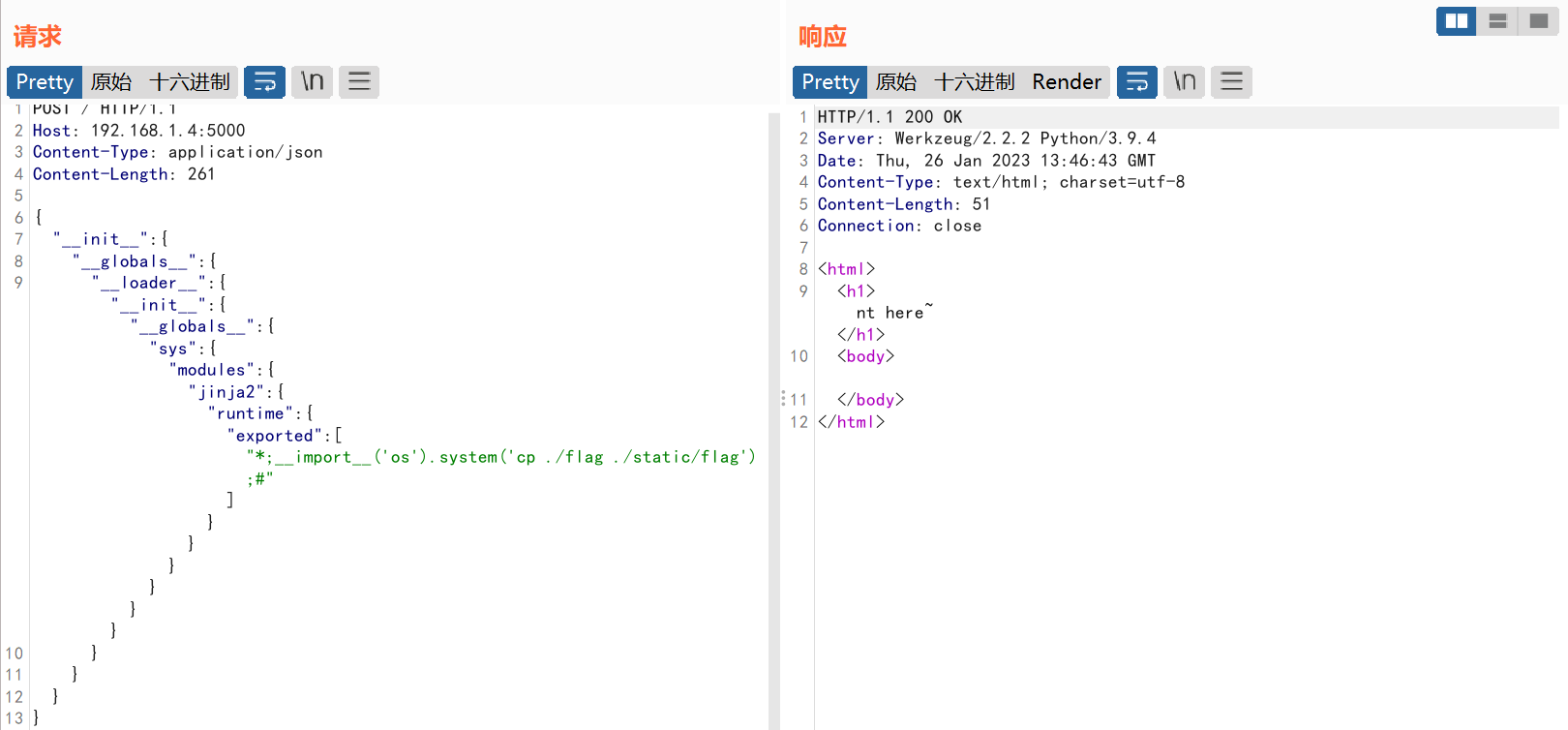 before_first_request修饰的init函数只会在第一次访问前被调用,而其中读取flag的逻辑又需要访问路由/后才能触发,这就构成了矛盾。所以需要使用payload在访问/后重置_got_first_request属性值为假,这样before_first_request才会再次调用。